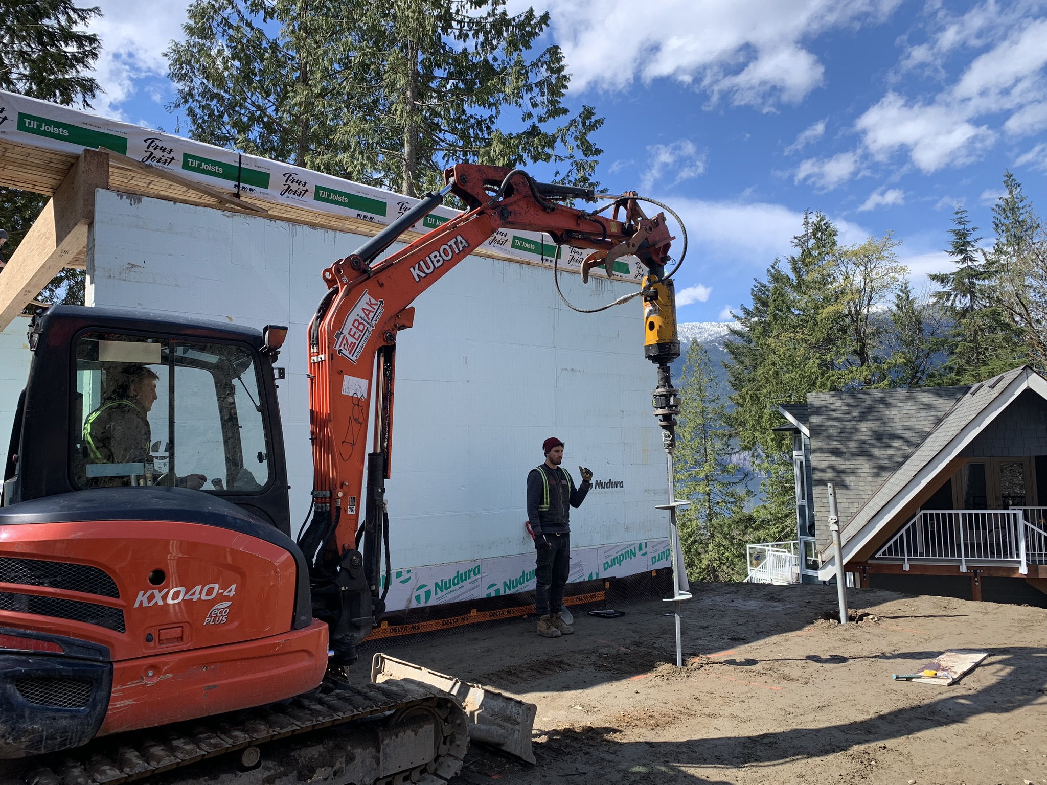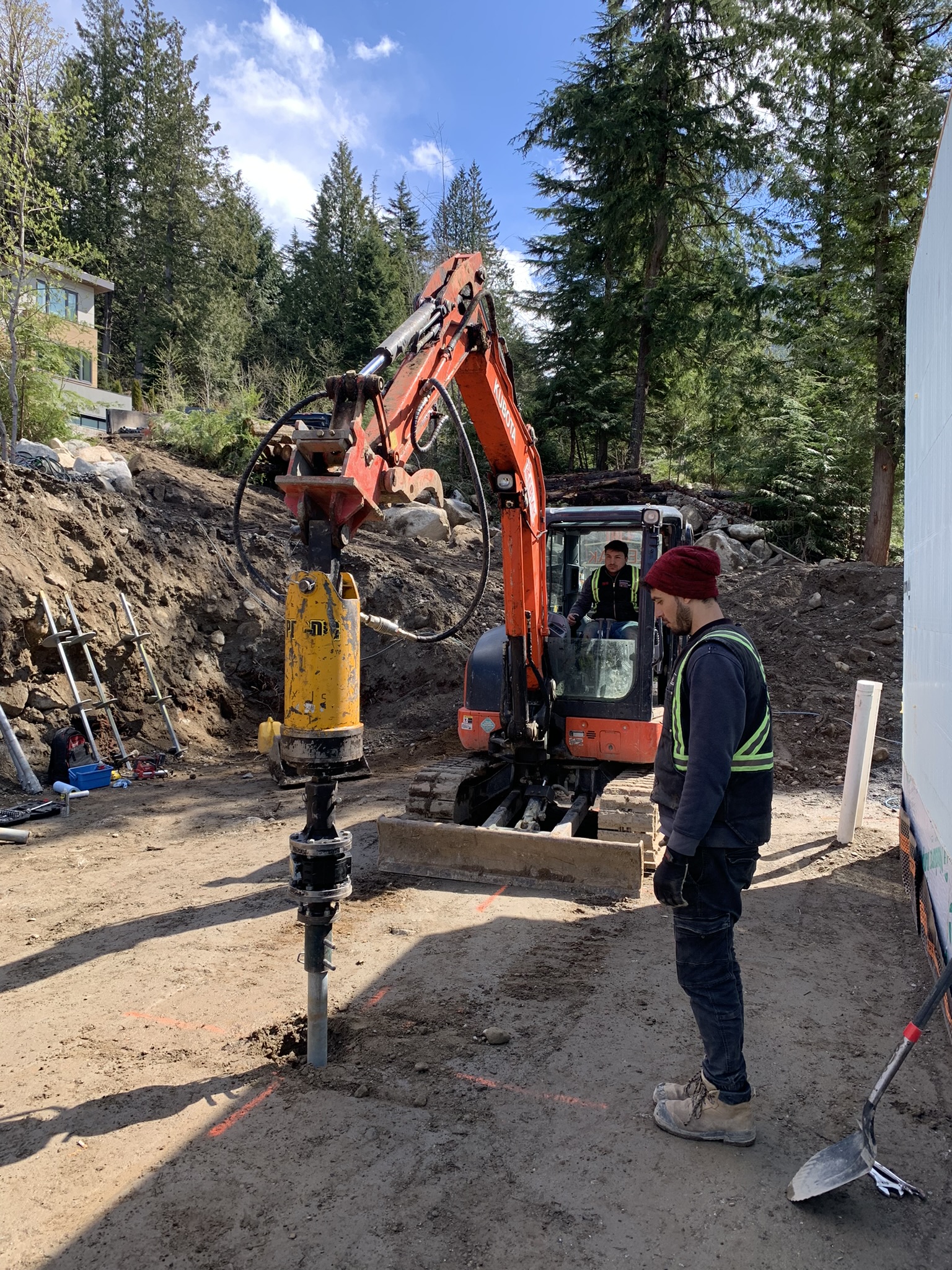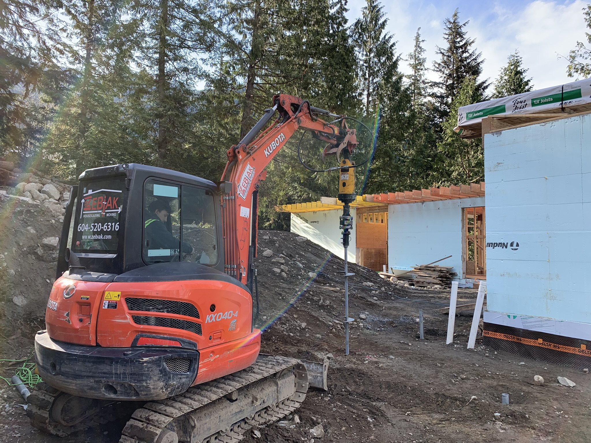 Zebiak was hired to install 6 helical piles for a deep foundation of a tiered retaining wall that supports a driveway on a steep slope. Due to the cobble prone subgrade a Chance SS to RS transition pile was selected. Piles went to approximately 15’ in depth for a capacity of 40 Kips.