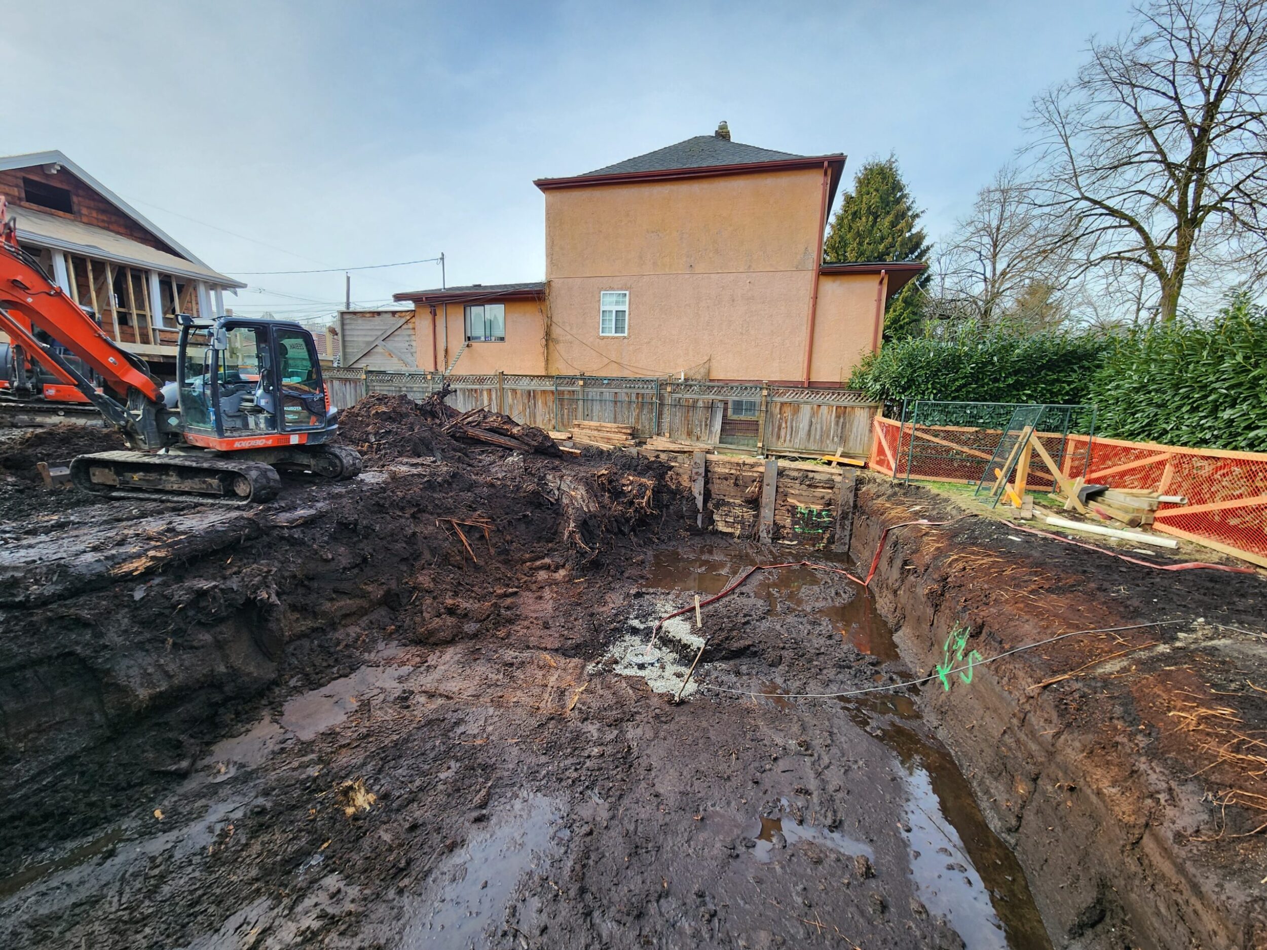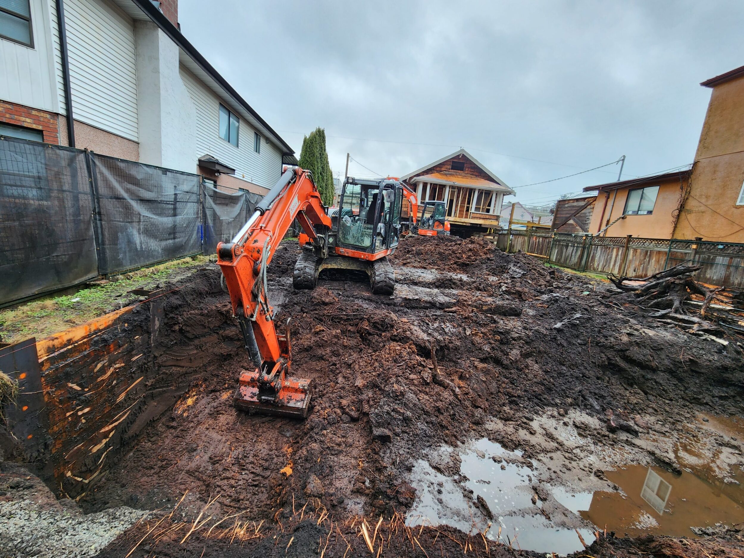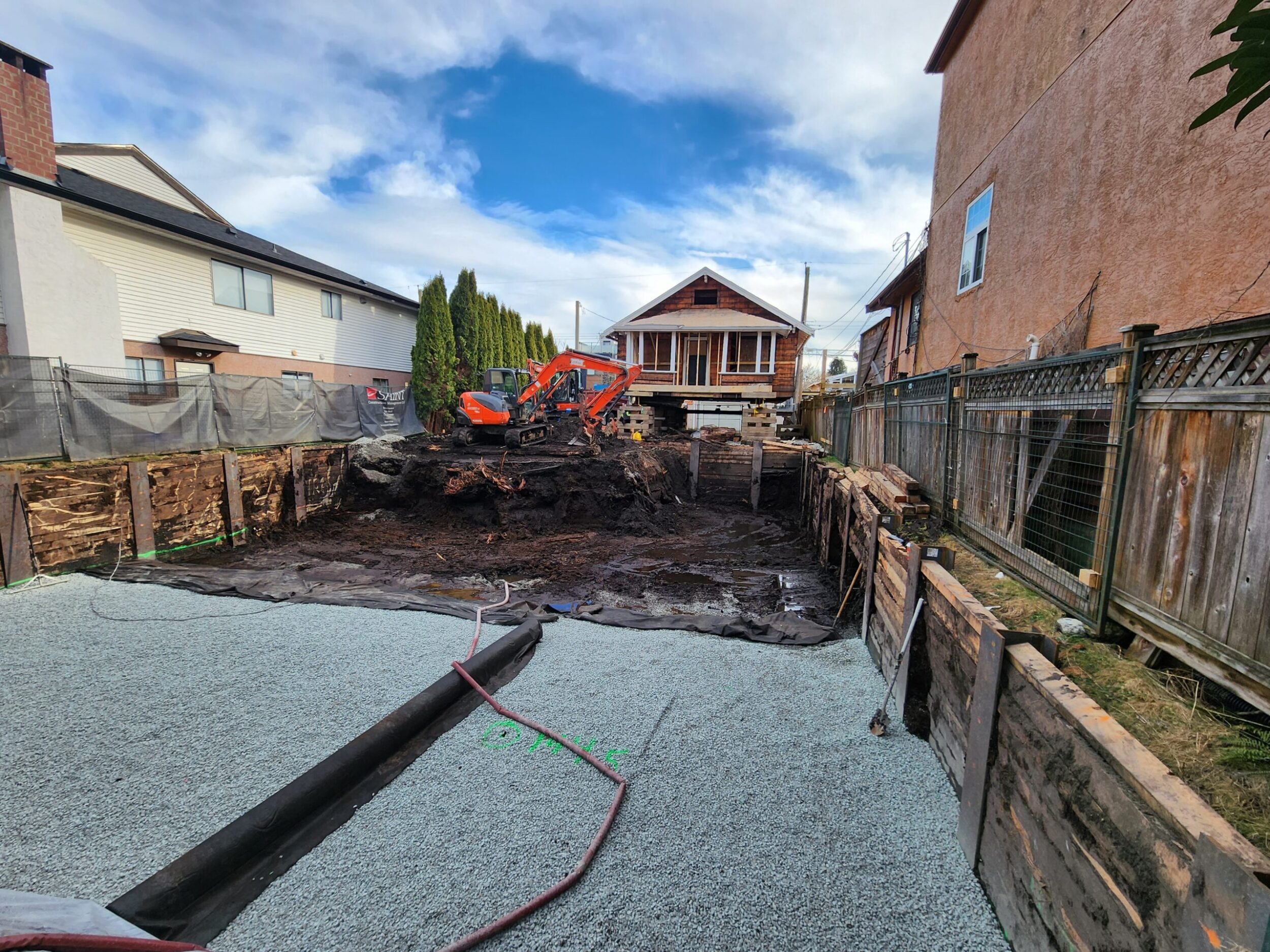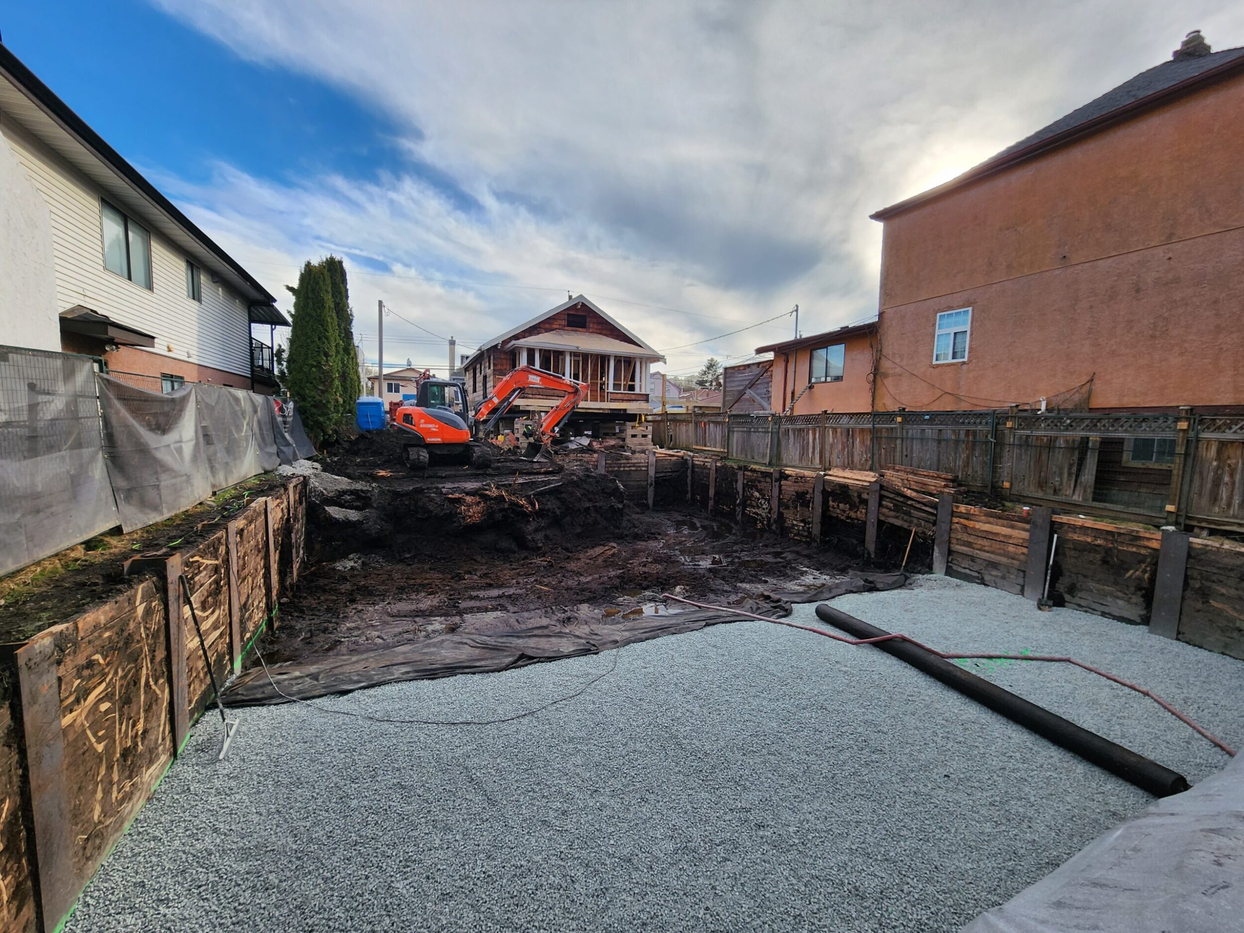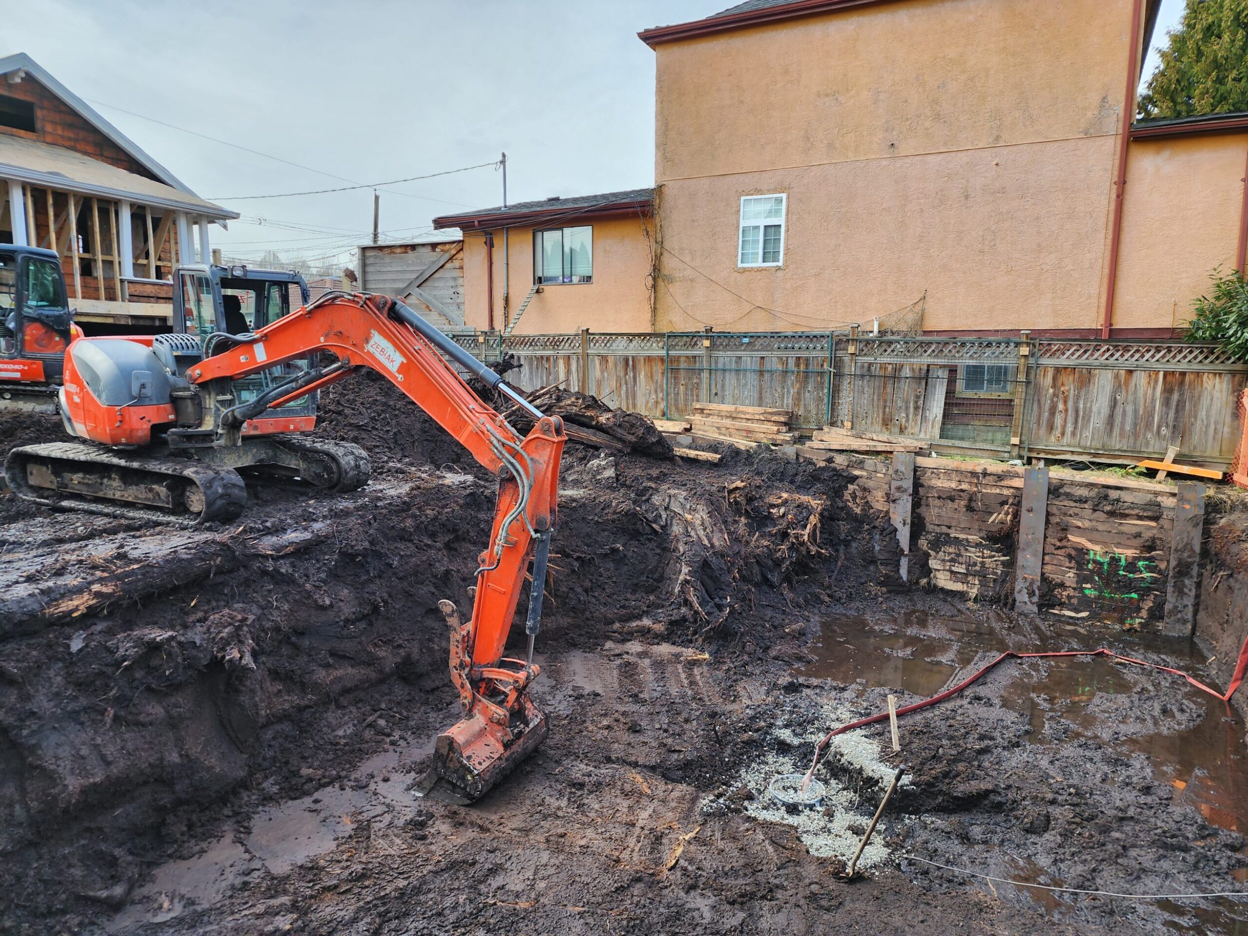 Zebiak supplied a full range of services on this East Vancouver MCD retention project. Our friends at Saint Construction took on the task of turning an old single-family home into a development with 4 units. This project is located in a peat area of Vancouver; the ground is moist, organic, spongy and soft. True compact bearing soil is not located until a depth of about 35 feet. It would be cost prohibitive to excavate so deep for foundations to sit on, thus helical piles were selected to support the new foundations. But before the piles could be installed, Zebiak had to carefully excavate the footprint of the basement for the main house. The ground is so soft that getting a machines badly stuck is a real possibility. Relying heavily on our experienced leadership, our operations made tactical use of swamp pads and a dig your way out approach to ensure this excavation ran smoothly and on schedule. Upon completion we laid a base of geotextile upon the peat and installed a 16 inch base layer of clear crush gravel. This set the stage for our next phase helical pile install and foundation construction.