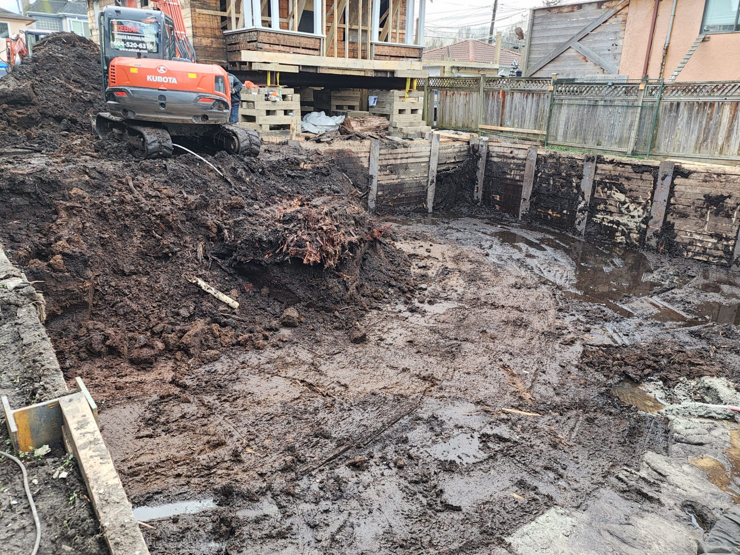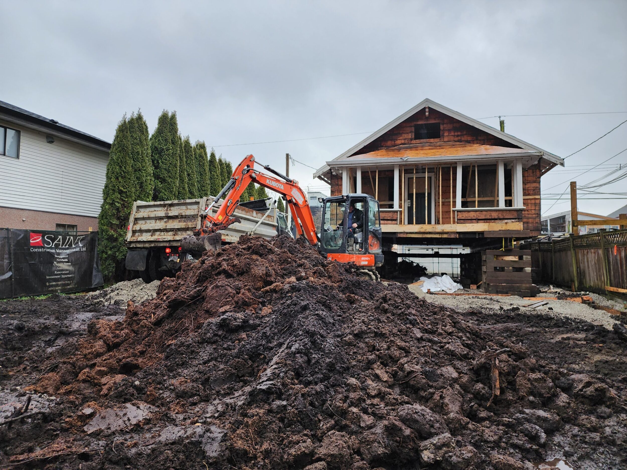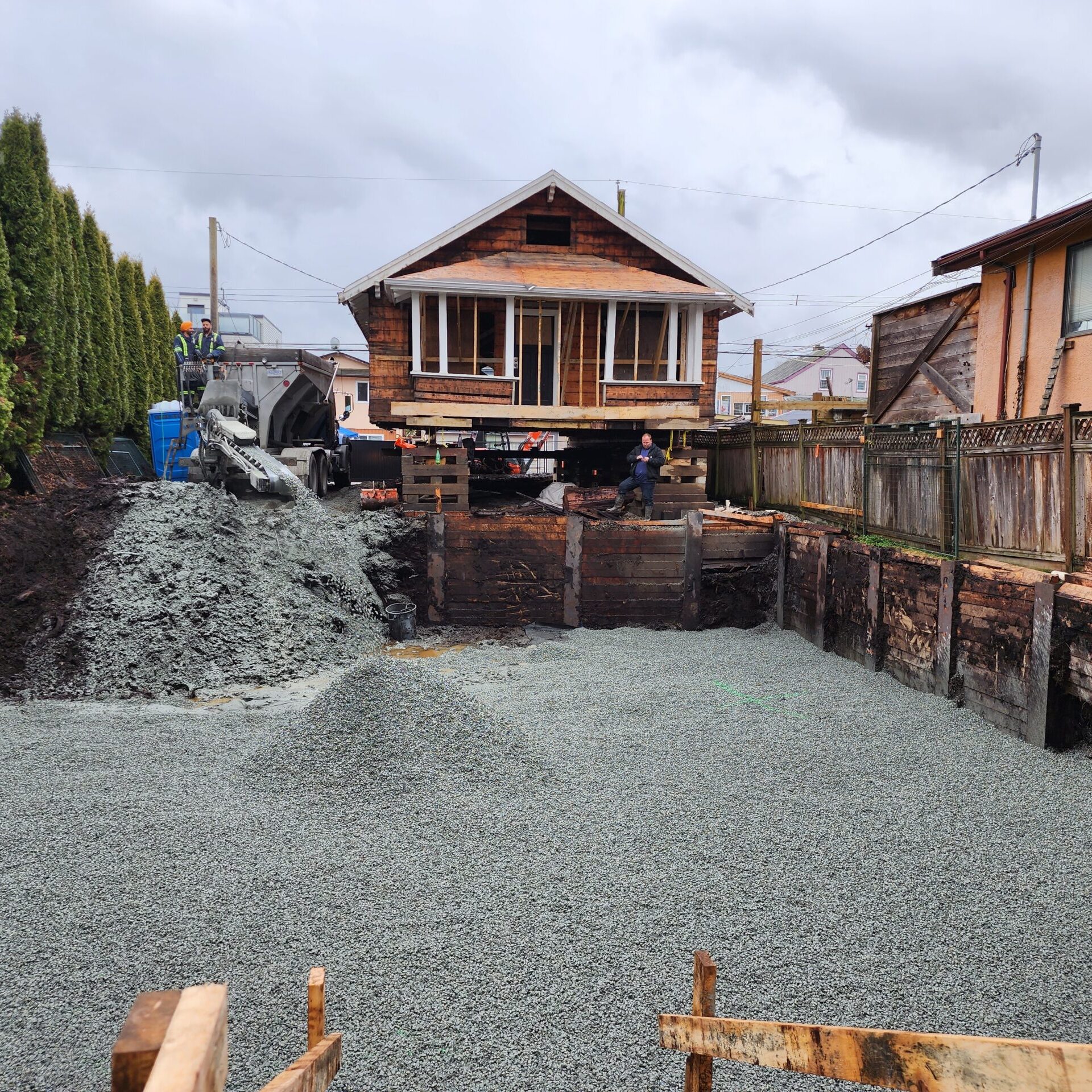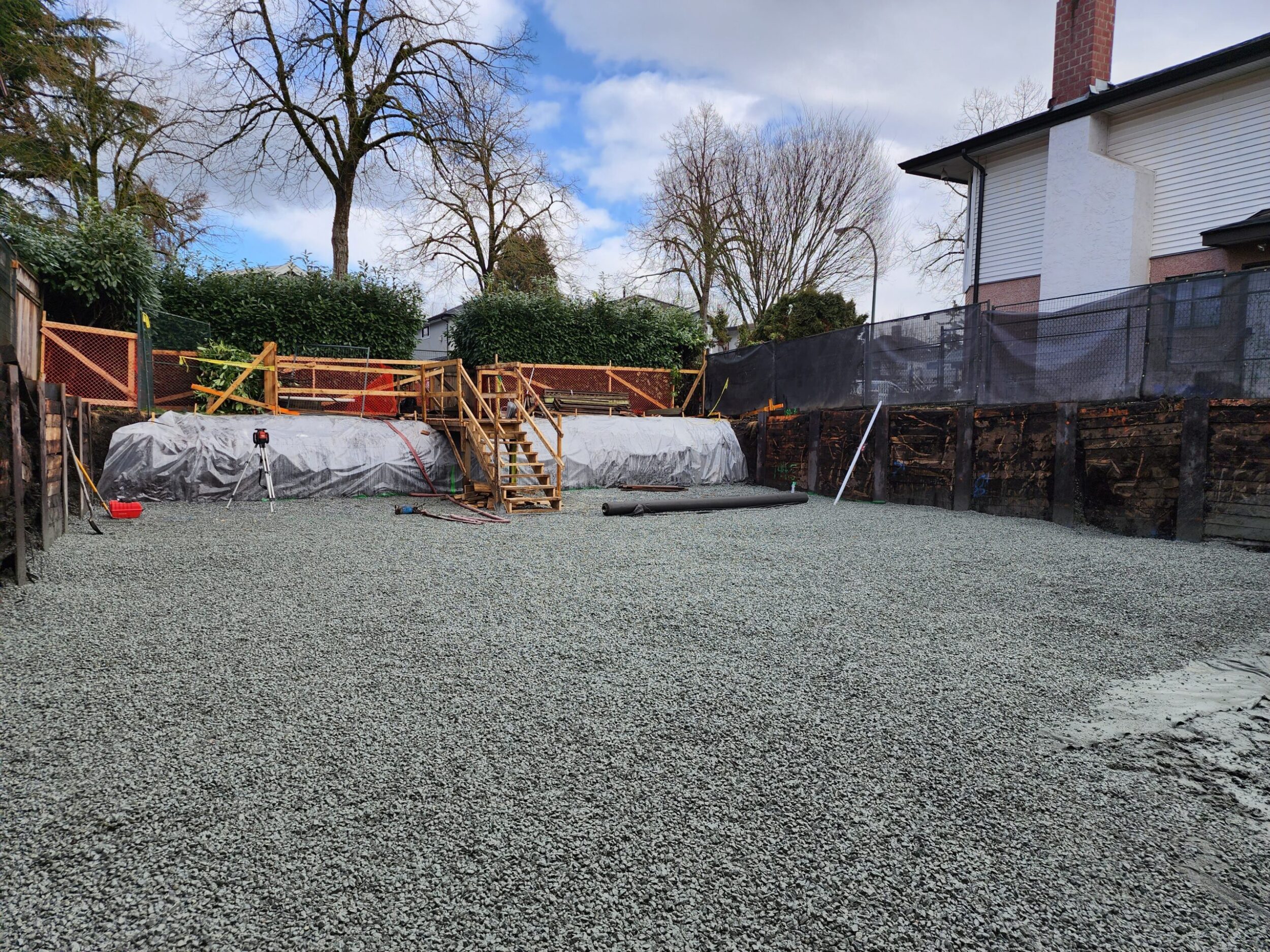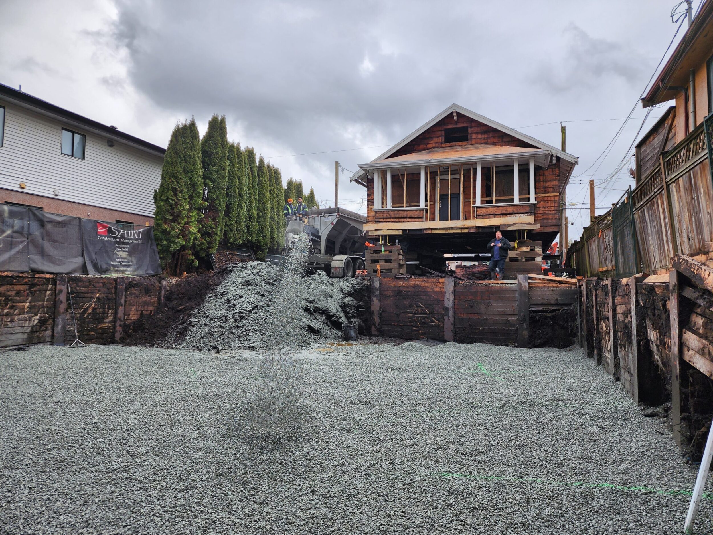 Zebiak supplied a full range of services on this East Vancouver MCD retention project. Our friends at Saint Construction took on the task of turning an old single-family home into a development with 4 units. This project is located in a peat area of Vancouver; the ground is moist, organic, spongy and soft. True compact bearing soil is not located until a depth of about 35 feet. It would be cost prohibitive to excavate so deep for foundations to sit on, thus helical piles were selected to support the new foundations. But before the piles could be installed, Zebiak had to carefully excavate the footprint of the basement for the main house. The ground is so soft that getting a machines badly stuck is a real possibility. Relying heavily on our experienced leadership, our operations made tactical use of swamp pads and a dig your way out approach to ensure this excavation ran smoothly and on schedule. Upon completion we laid a base of geotextile upon the peat and installed a 16 inch base layer of clear crush gravel. This set the stage for our next phase helical pile install and foundation construction.