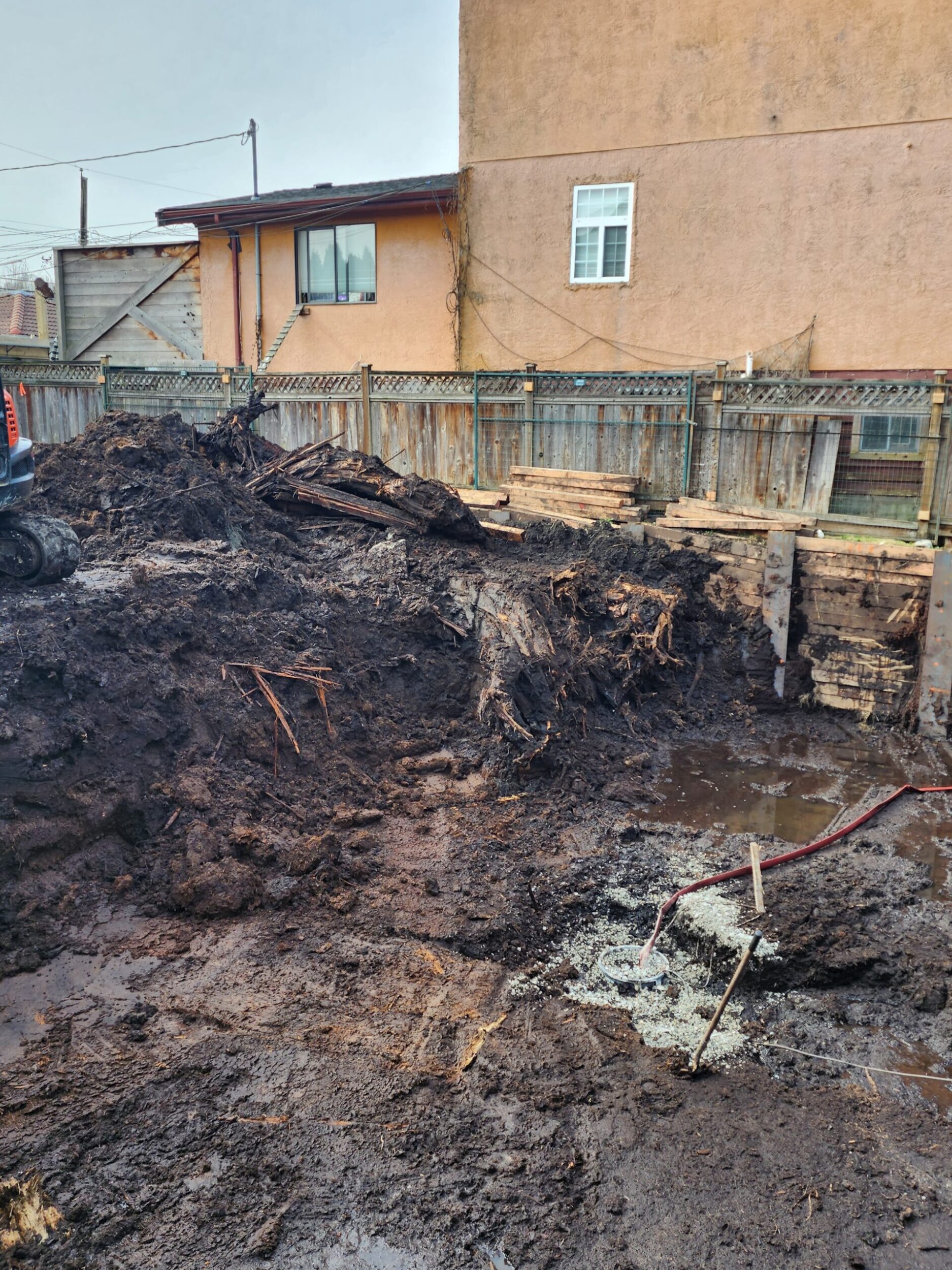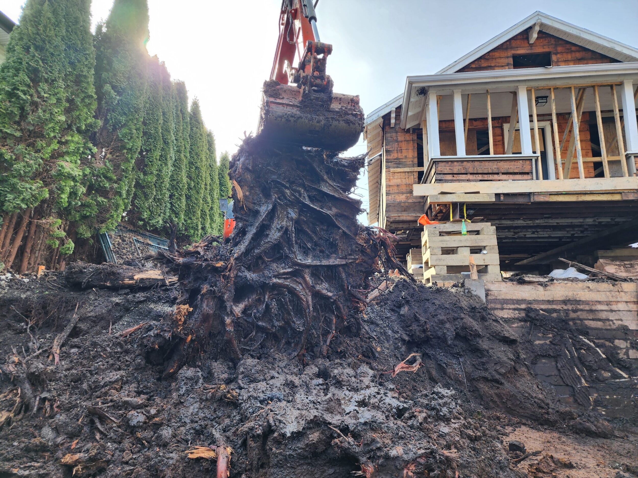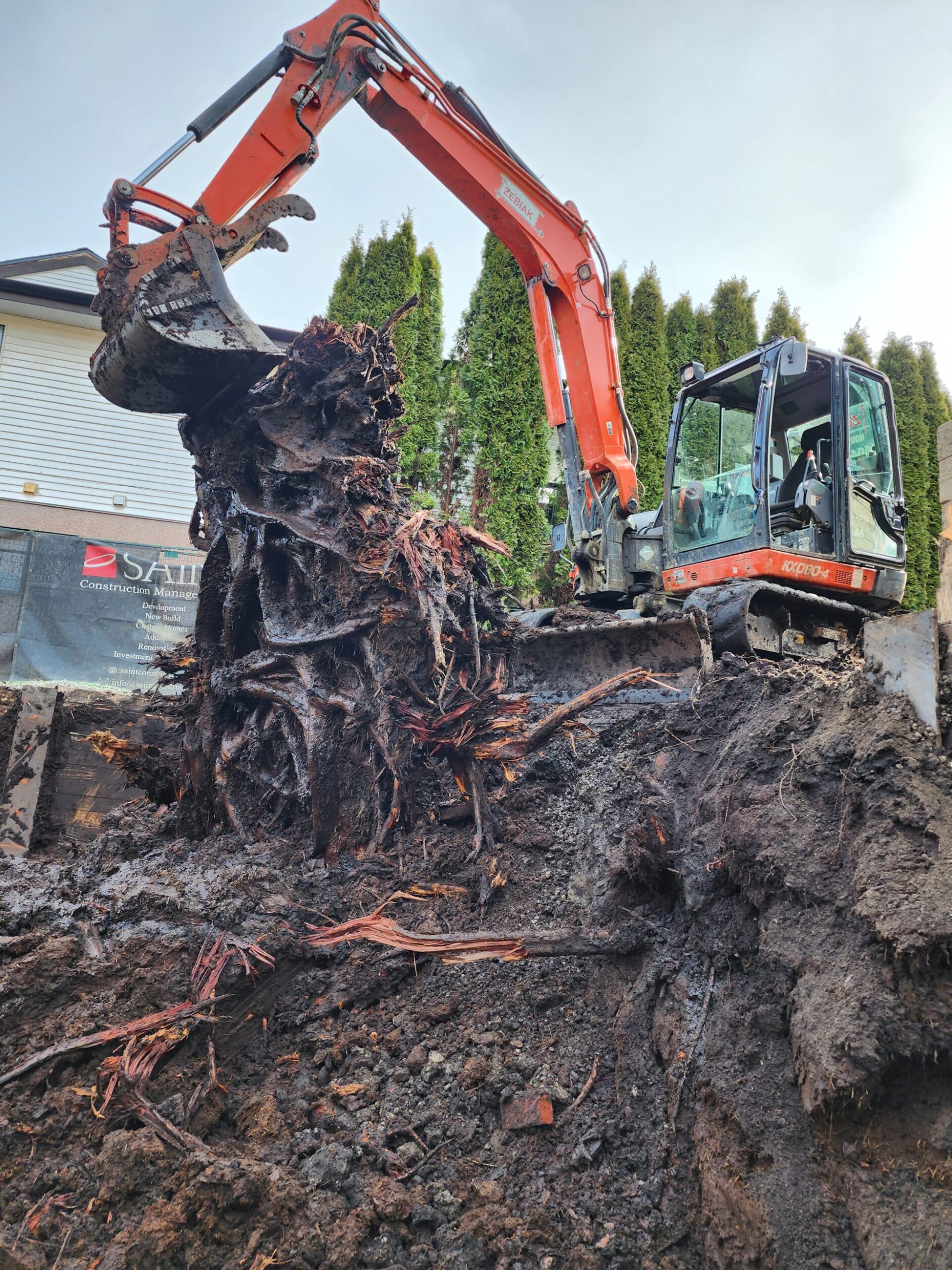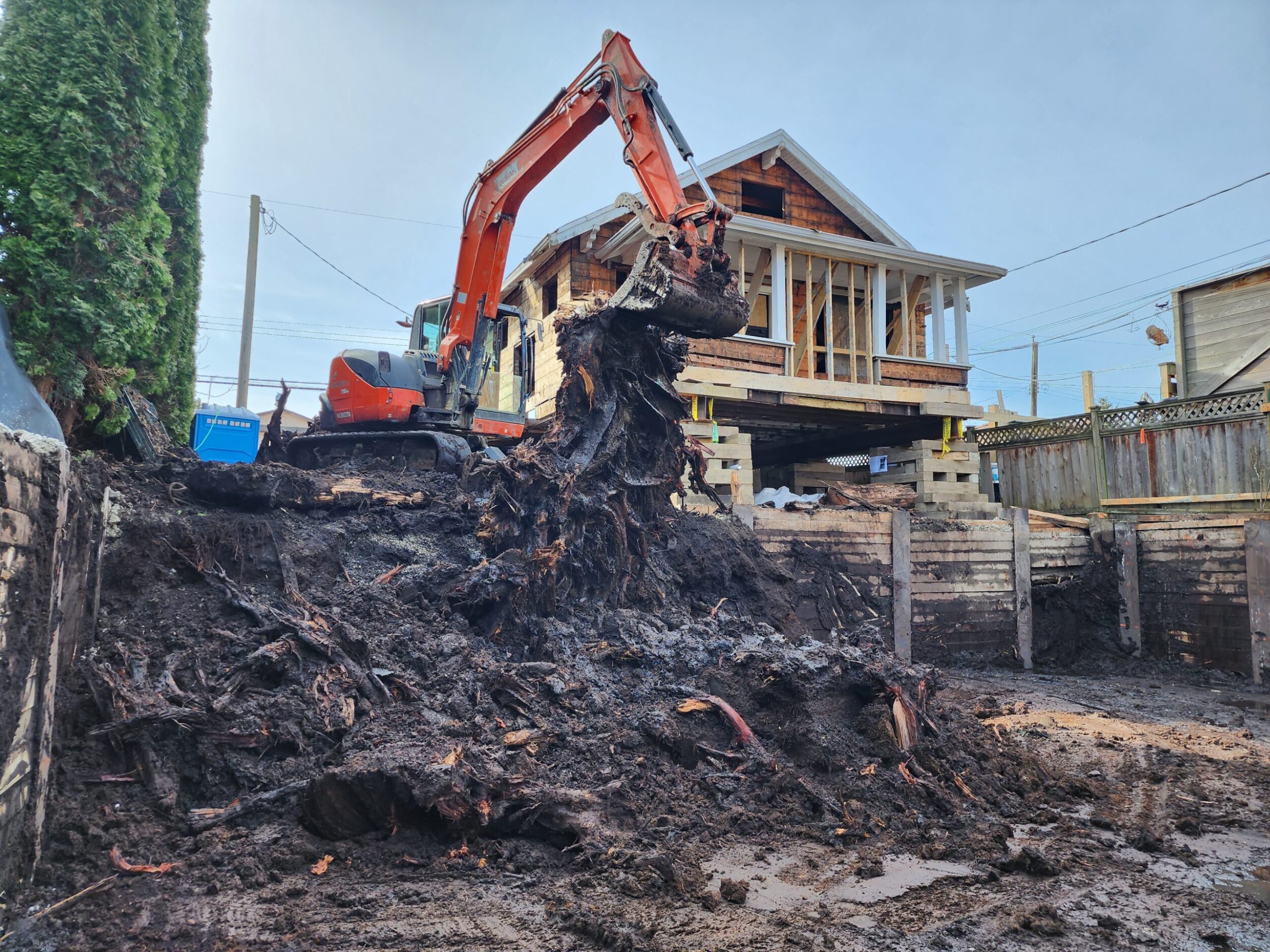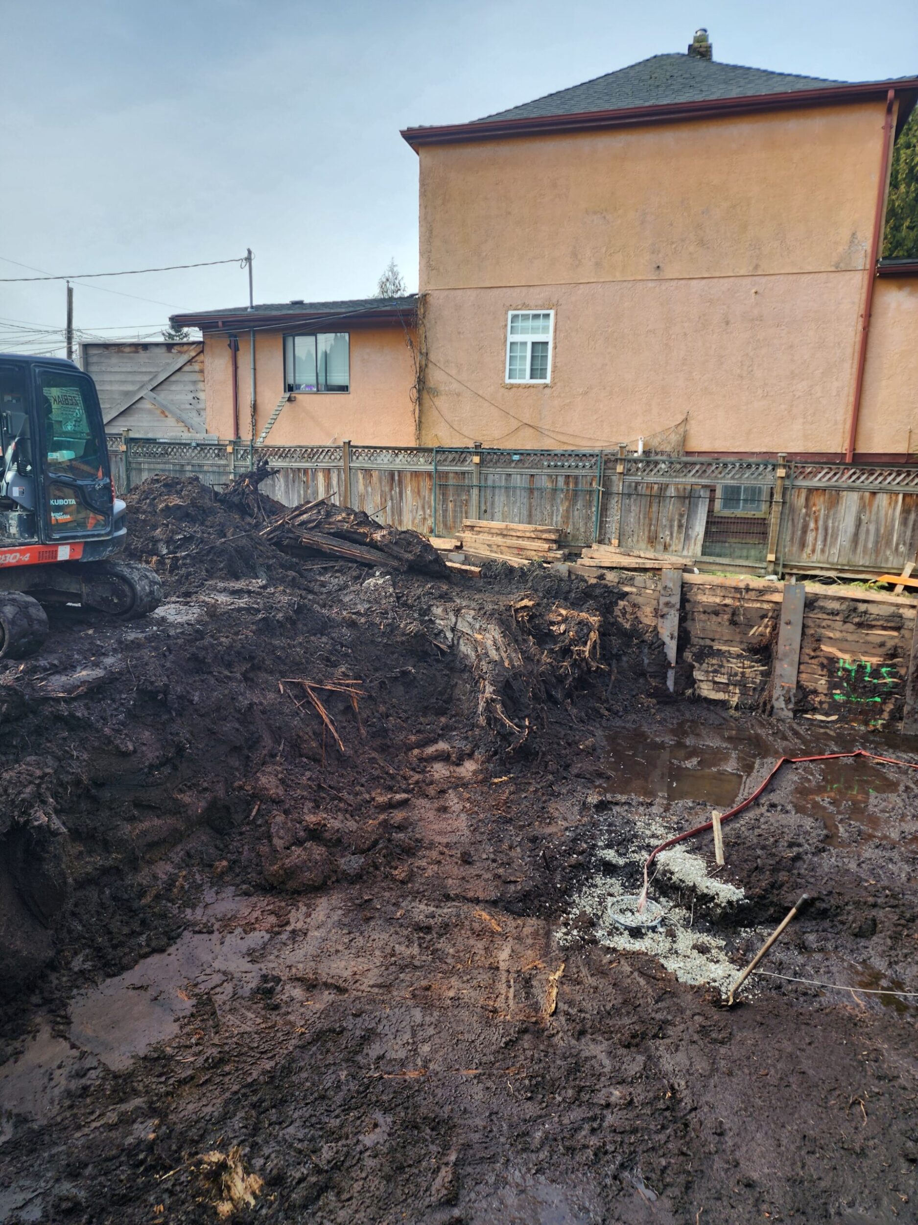 Zebiak supplied a full range of services on this East Vancouver MCD retention project. Our friends at Saint Construction took on the task of turning an old single-family home into a development with 4 units. This project is located in a peat area of Vancouver; the ground is moist, organic, spongy and soft. True compact bearing soil is not located until a depth of about 35 feet. It would be cost prohibitive to excavate so deep for foundations to sit on, thus helical piles were selected to support the new foundations. But before the piles could be installed, Zebiak had to carefully excavate the footprint of the basement for the main house. The ground is so soft that getting a machines badly stuck is a real possibility. Relying heavily on our experienced leadership, our operations made tactical use of swamp pads and a dig your way out approach to ensure this excavation ran smoothly and on schedule. Upon completion we laid a base of geotextile upon the peat and installed a 16 inch base layer of clear crush gravel. This set the stage for our next phase helical pile install and foundation construction.